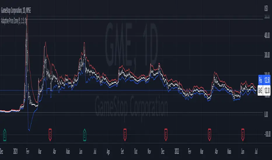 The Adaptive Price Zone was developed by Lee Leibfarth in 2006, and it attempts to create a band for mean-reversal strategies. It works by taking the double-smoothed average of the volatility from 5 days and adding/subtracting it from the average price of the day (hl2).