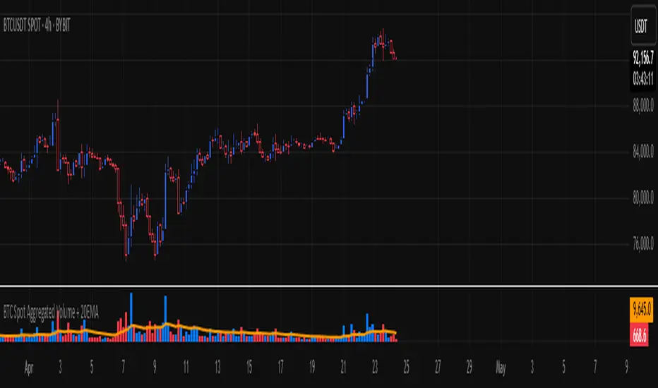 This indicator is particularly useful for traders who want a broader view of real BTC spot market activity, rather than relying on a single exchange's data, which might be misleading or incomplete. By averaging across major exchanges, the indicator helps reduce noise and gives a more accurate picture of volume trends.