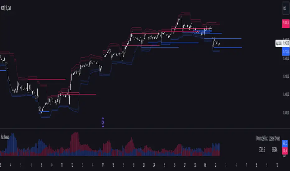 Risk-Reward Calculation: Based on the highest and lowest price levels over the set period and the calculated deviations, it determines the potential upside reward and downside risk. The reward is calculated as the distance between the current price and the upper resistance levels, while the risk is determined as the distance to the lower support levels.