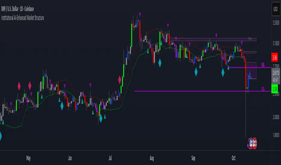This indicator combines institutional trading concepts (Smart Money Concepts) with a proprietary AI-inspired probability scoring system to identify high-probability trading opportunities. Unlike standard trend-following or support/resistance indicators, this tool integrates multiple institutional order flow concepts and quantifies their confluence through a dynamic scoring algorithm that adapts to market conditions.