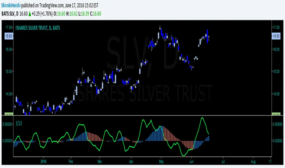 Constance Brown liked to use this by taking the first break of the zero line by the 3/10 oscillator in the direction of the trend-line relative to above or below zero. The similarities between the histogram and the MACD histogram are striking and its use is almost the same. Useful for seeing divergence in the same way noted by DR. Elder, take the first opposite colored bar after divergence which he stated was to have one peak lower than the previous but must break below zero in between. (opposite is true for bearish play)