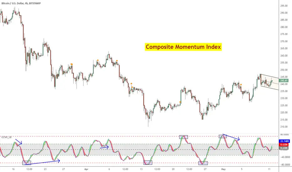 This is a composite oscillator derived from modified 5/10/20 Chande's Dynamic Momentum Index values.