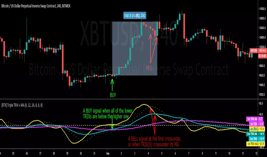 - A crossunder of the lower TRIX to the higher one indicates a SELL signal.