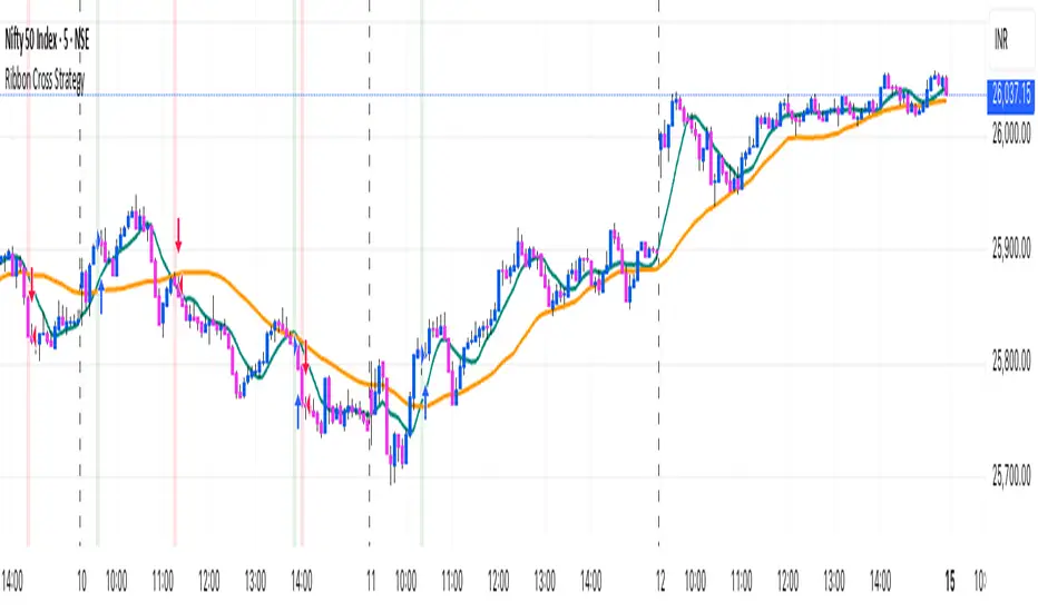 This strategy uses a simple moving-average ribbon crossover system with a customizable entry filter. You can choose whether trades trigger near the fast or slow average, allowing flexibility in capturing early or confirmed trend moves.