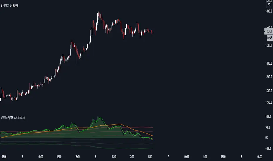 This indicator displays a histogram for the distance of closing price from a VWAP value. The VWAP length is rolling and its value is user defined. Additionally, there are 3 bands which are based on the %-value of the underlying ATR. The ATR's length can be chosen by the user, and the distance multipliers may also be chosen. Lastly, there are two simple moving averages which have user-defined lengths and are based on the histograms value.