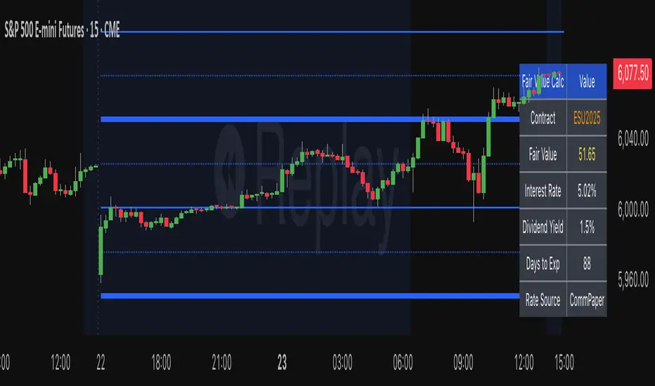 - Calculates the fair value premium between ES futures and SPX using real-time interest rate data, dividends, and time to expiration