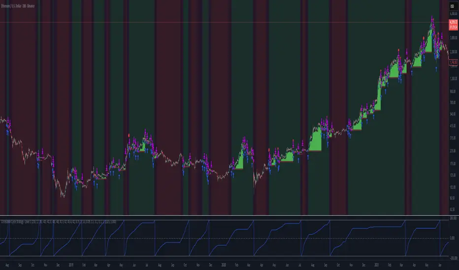 This strategy is based on John Ehlers idea of the correlation cycle, and that markets often oscillate. They move up and down in cycles, though not perfectly sinusoidal, they can be approximated by a sinusoidal wave. This script measures the strength of the correlation between price and a range of ideal sine wave components of different periods. By doing this, we estimate which cycle length the market is most currently following and from that, we find the phase to learn in which part of the cycle we are in.