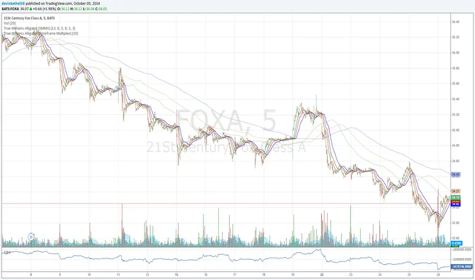 Modified version of the true alligator indicator (ie SMMA) that features a timeframe multiplier so that you can monitor the elliott wave of higher timeframes. (See original "True Williams Alligator" for more details.)