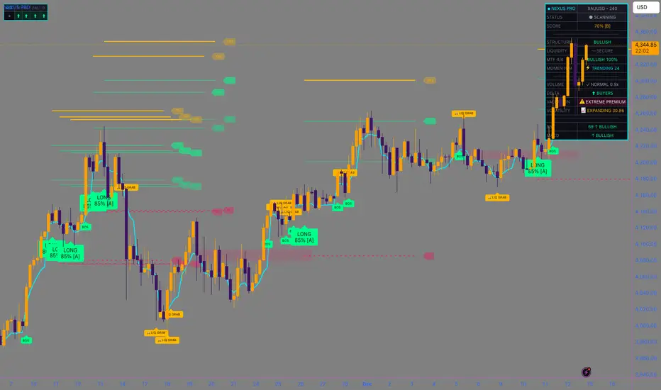 Most indicators lag behind price, trapping retail traders into late entries. NEXUS PRO takes a different approach. It combines Liquidity Sweep Detection, Orderflow Analysis, and Multi-Timeframe Trend Structure into a single proprietary "Neural Score."