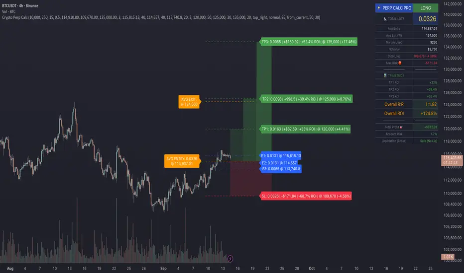 **Crypto Perp Calc Pro - Advanced Perpetual Position Calculator**A comprehensive position sizing and risk management tool designed specifically for perpetual futures trading. This professional-grade indicator eliminates complex calculations by providing real-time position metrics directly on your chart.