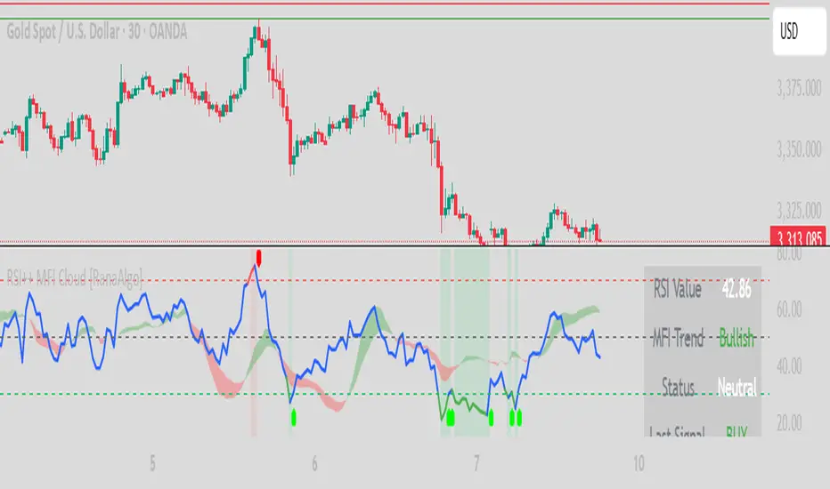 This indicator combines RSI (Relative Strength Index) with MFI (Money Flow Index) to generate trading signals with additional confirmation filters. The key features include: