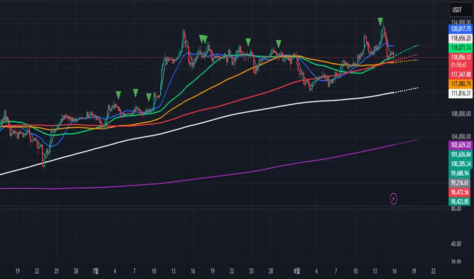 조건: 이동평균이 정배열(5>20>60>112>224>448>(896)) 또는 역배열(5<20<60<112<224<448<(896))로 새로 전환되는 순간 삼각형 마커가 생성됩니다.