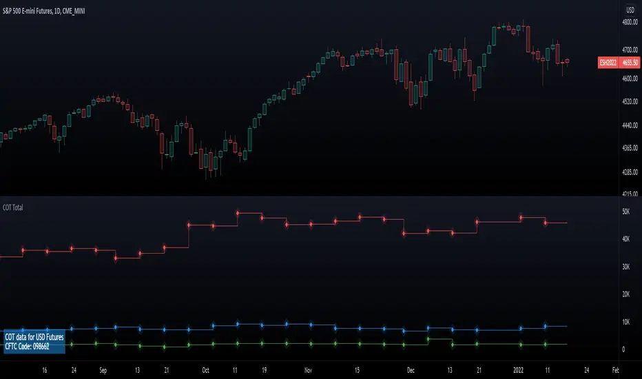 This indicator displays the Commitment of Traders (COT) totals data for futures markets.