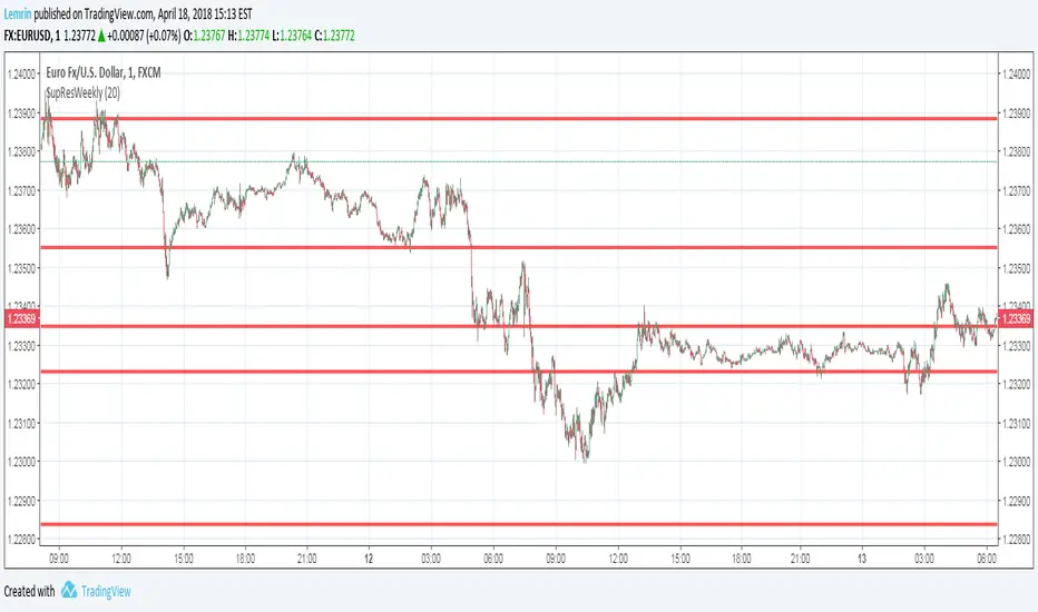 This indicator plots horizontal lines for the high and low of each of the last x weeks (configurable from 1 to 20). Increasing this number beyond 20 is not possible due to some technical Pine limitations. I am also publishing a daily and monthly version...add them all to the same chart! Written for TV user: kvpatel
