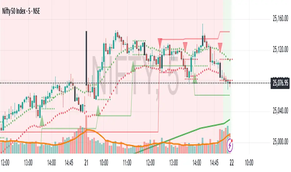 Updated with Signal candle mid range (dashed lines) to access the price trend. If any of the next few candles close above the id range then price may move up and stay below the mid range price may go down. Therefore, for buy signal we want candles to stay above mid range otherwise ignore and for sell signals candle close should be below the mid range for validity.Also modified to include gap-up and gap-down days around ATR band lines for signals.