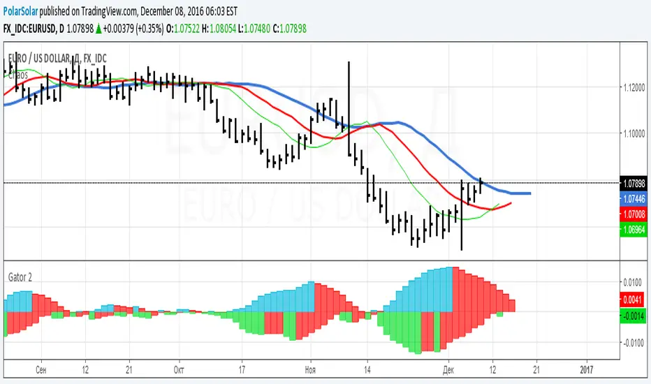 Gator Oscillator helps to better visualize the upcoming changes in the trends: to know when Alligator sleeps, eats, fills out and is about to go to sleep.