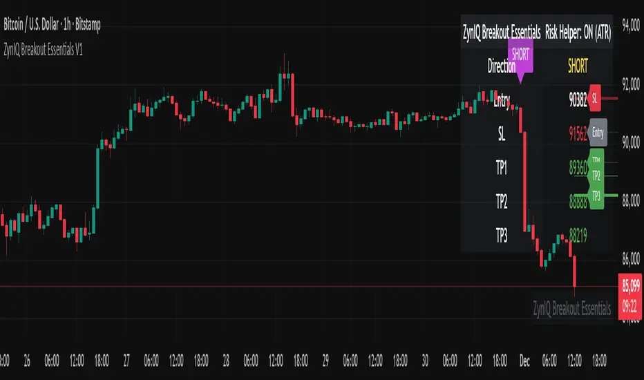 ZynIQ Breakout Essentials + Risk v1 is a breakout-based tool designed for traders who want a clean, rules-driven framework for identifying consolidation zones, breakout levels, and structured stop/target planning. It highlights key areas where price may transition from compression into momentum.