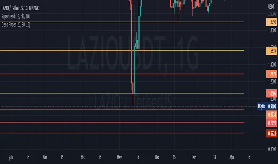 EN : It is almost impossible to buy cryptocurrencies from the bottom or sell from the top, in order to catch these points, to wait with the least loss in the position and to exit the trade in the most profitable way, you should gradually buy and gradually sell the product in your hand.The Deep Finder indicator marks you the acquisition points gradually and systematically. Re-purchasing the total amount you bought at each stage shown will help you lower your average and keep your loss at the lowest level.