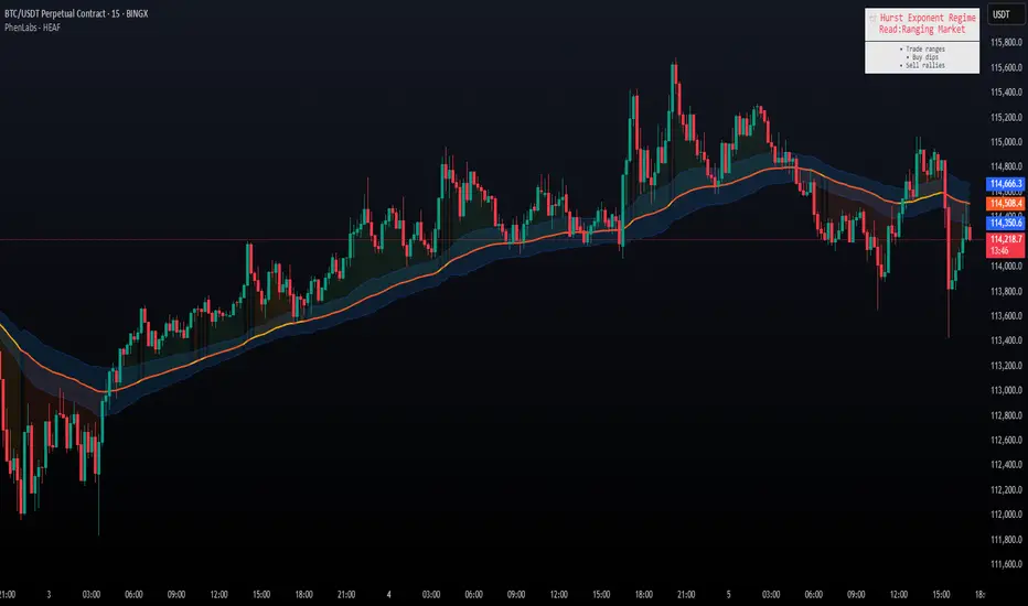 The Hurst Exponent Adaptive Filter (HEAF) is an advanced Pine Script indicator designed to dynamically adjust moving average calculations based on real time market regimes detected through the Hurst Exponent. The intention behind the creation of this indicator was not a buy/sell indicator but rather a tool to help sharpen traders ability to distinguish regimes in the market mathematically rather than guessing. By analyzing price persistence, it identifies whether the market is trending, mean-reverting, or exhibiting random walk behavior, automatically adapting the MA length to provide more responsive alerts in volatile conditions and smoother outputs in stable ones. This helps traders avoid false signals in choppy markets and capitalize on strong trends, making it ideal for adaptive trading strategies across various timeframes and assets.