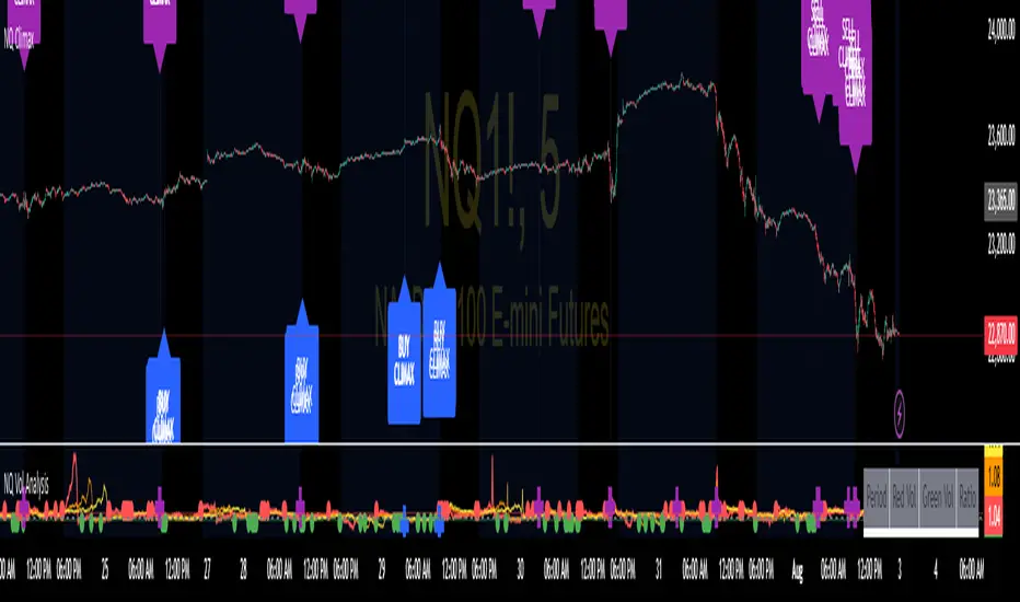 This specialized overlay indicator identifies extreme volume exhaustion points (climaxes) in NQ1! (Nasdaq 100 E-mini futures) that often signal major market reversals. By analyzing volume spikes relative to historical patterns, it helps traders spot potential turning points before they become obvious to the broader market.