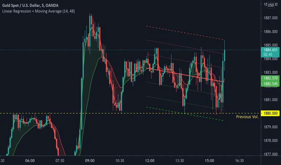 1. Linear Regression including 2 x Standard Deviation + High / Low. Middle line colour depends on colour change of Symmetrically Weighted Moving Average [2]. Green zones indicate good long positions. Red zones indicate good short positions. (Custom)