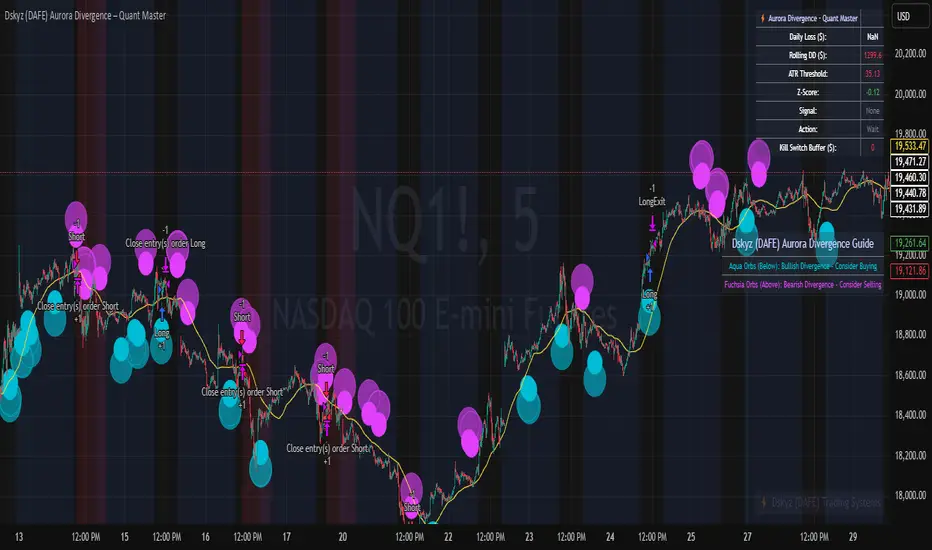 The Aurora Divergence indicator was a cult favorite for spotting price-OBV divergences with its aqua and fuchsia orbs, but traders craved a system to act on those signals with discipline and automation. This strategy delivers, layering advanced filters (z-score, ATR, multi-timeframe, session), dynamic risk controls (kill switches, adaptive stops/TPs), and a real-time dashboard to turn insights into profits. Whether you’re a newbie dipping into futures or a pro hunting reversals, this strat’s got your back with a beginner guide, alerts, and visuals that make trading feel like a sci-fi mission. Let’s dive into every detail and see why this original DAFE creation is a must-have.