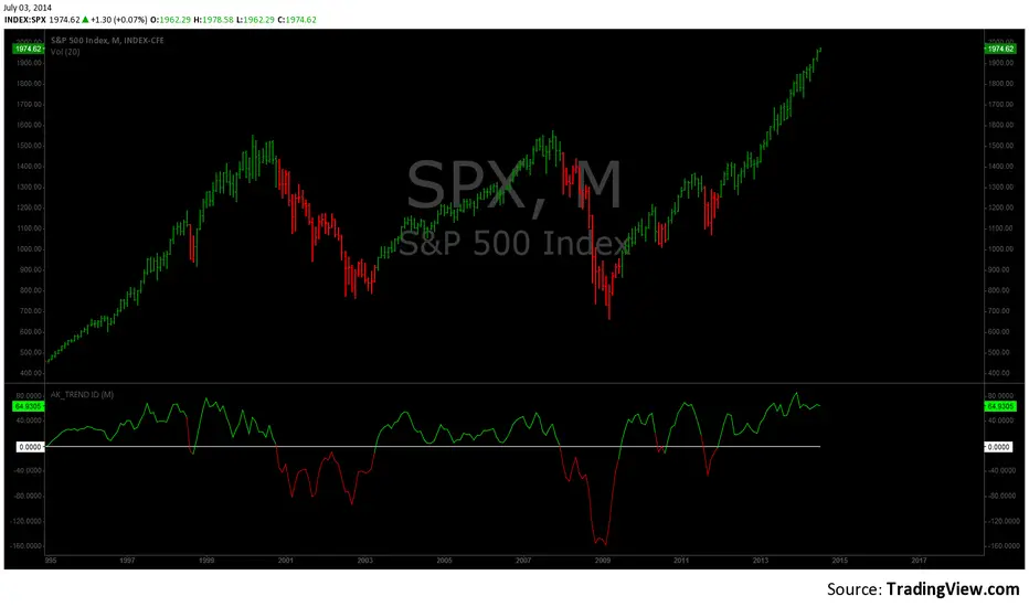 Although the backtesting results are good, the AK TREND ID is not to be used as a trading system. It is simply design to let you know when to invest and when to get out. I'm working a more accurate version of this Indicator , that will use both technical and fundamental data. In the mean time , I hope this will give some of you piece of mind, and eliminate emotions from your trading decision. Feel free to modify the code as you wish, but please share your finding with the rest of Trading View community.