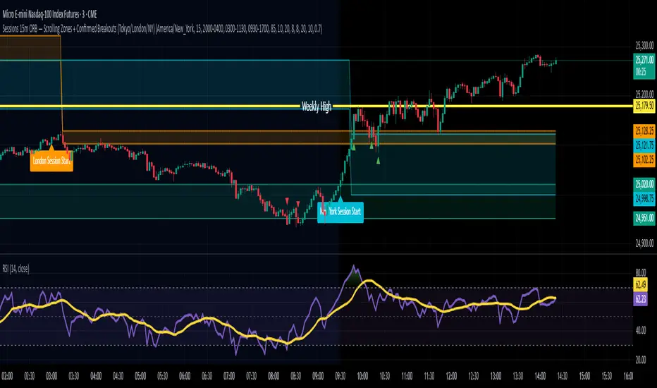 This indicator automatically plots the first 15-minute Opening Range Breakout (ORB) for each major trading session — Tokyo, London, and New York — and highlights them with shaded zones that scroll dynamically with your chart.