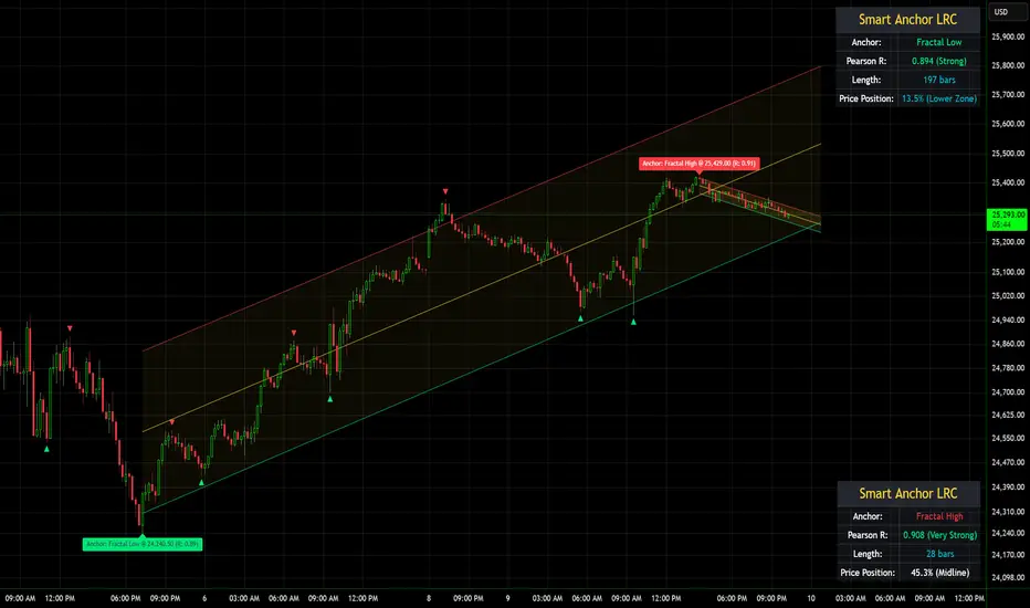 Most regression channel indicators use arbitrary fixed lookback periods. This indicator anchors to real market structure (fractals) and uses statistical optimization (Pearson R) to select the best anchor point. The result is a channel that is both structurally meaningful and statistically valid — not just a line drawn from an arbitrary starting point.