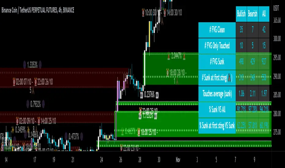 - Includes a statistics panel that allows a quick view of the behavior of the FVGs in the asset and work timing.