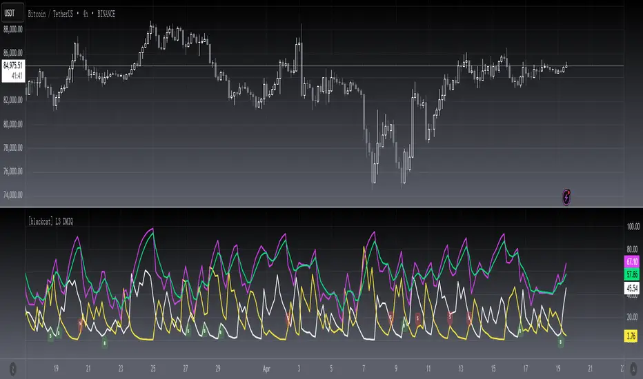 OVERVIEWThe [blackcat] L3 DMIQ indicator is designed to help traders analyze market trends using the Directional Movement Index (DMI) and its derivatives. This indicator calculates various components of the DMI, including Plus DI, Minus DI, ADX, and ADX Rating, providing a comprehensive view of trend strength and direction. It also generates buy and sell signals based on specific conditions, helping traders make informed decisions 📈💹.