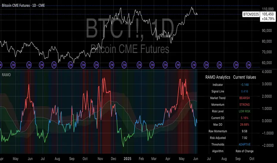 RAMO's adaptive components enable regime-aware signal generation, addressing the regime-switching behavior documented in financial markets (Hamilton, 1989; Guidolin, 2011). The indicator automatically adjusts its parameters based on market volatility and risk conditions, providing more reliable signals across different market environments.