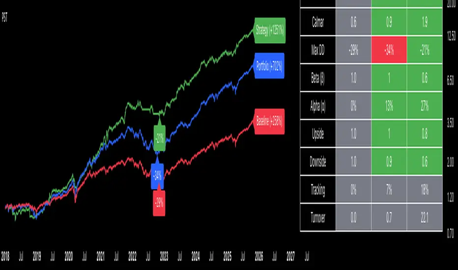 Cumulative returns are displayed on each label as the total percentage gain from the selected start date, with green indicating positive returns and red indicating negative returns. In the table, baseline metrics serve as the benchmark reference and are always gray. For portfolio metrics, green indicates outperformance relative to the baseline, while red indicates underperformance relative to the baseline. For strategy metrics, green indicates outperformance relative to both the baseline and the portfolio, red indicates underperformance relative to both, and gray indicates underperformance relative to either the baseline or portfolio. Metrics such as Volatility, Tracking Error, and Turnover ratio are always displayed in gray as they serve as descriptive measures.