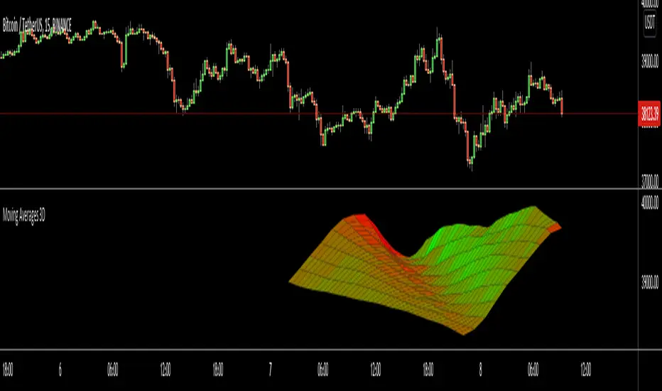 This is an experimental work to show 10 moving averages in 3D by using linefill.new() feature of the Pine language.