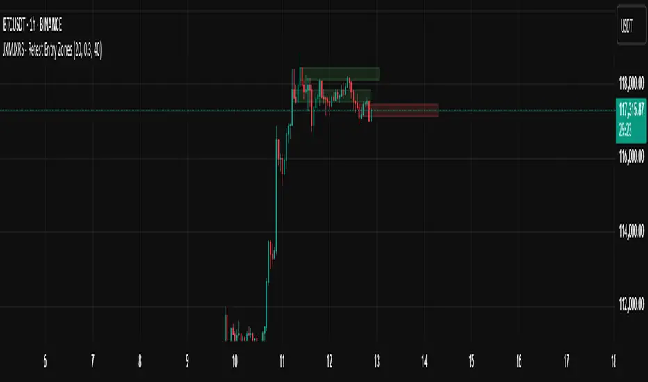 This indicator identifies directional breakout retest zones based on structural price levels. It is built for traders who look for secondary entry opportunities after breakouts—often referred to as "retest entries." It is particularly suited to crypto markets and other volatile assets where breakout-retest behavior is frequent and tradable.The indicator monitors recent price structure and identifies breakouts above or below key levels using a configurable lookback window. When a breakout occurs, it automatically plots a colored zone in the direction of the move: