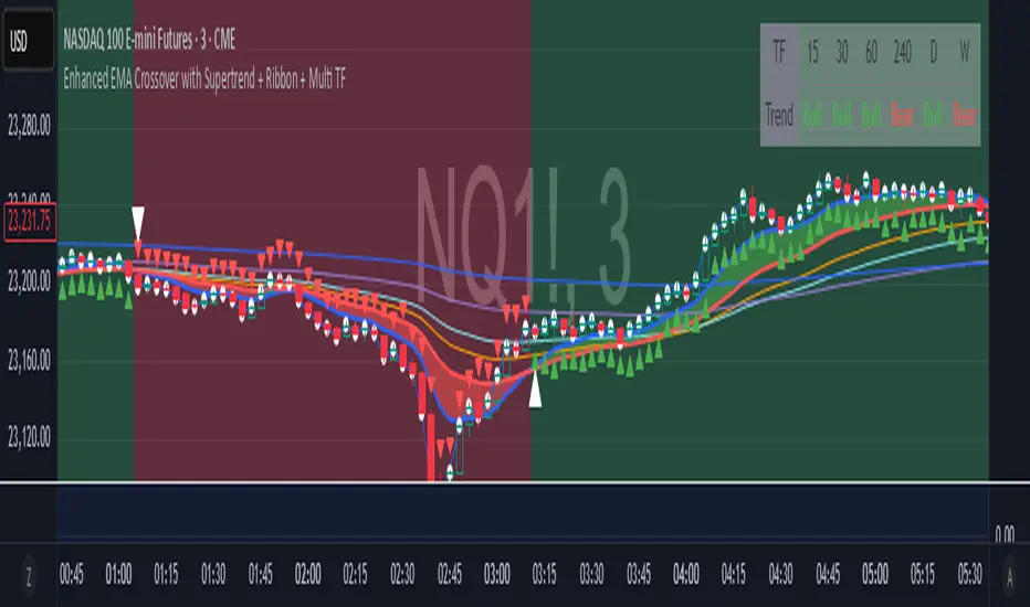This indicator has 4 different tradingview indicators in one. Added the popular supertrend indicator, added a multi-timeframe trend table. Including the 2 ema crossover indicator and the moving average ribbon all 4 indicators are fully customizable to your likings, The color opacity on all the indicators are also fully customizable for easy trend identification. The main goal of this multi-indicator is to keep you on the right side of the price trend.開源腳本