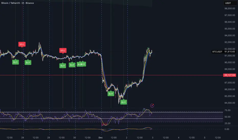 This indicator is a focused scalping tool designed for crypto markets, specifically optimized for the 15-minute timeframe. It combines a classic trend-following approach with market flow data to help identify short-term reversals while filtering out weak signals. The core logic relies on a crossover between the 9 EMA and 15 EMA to detect trend changes, but a trade signal is only generated if the Open Interest is currently trading above its 20-period average.