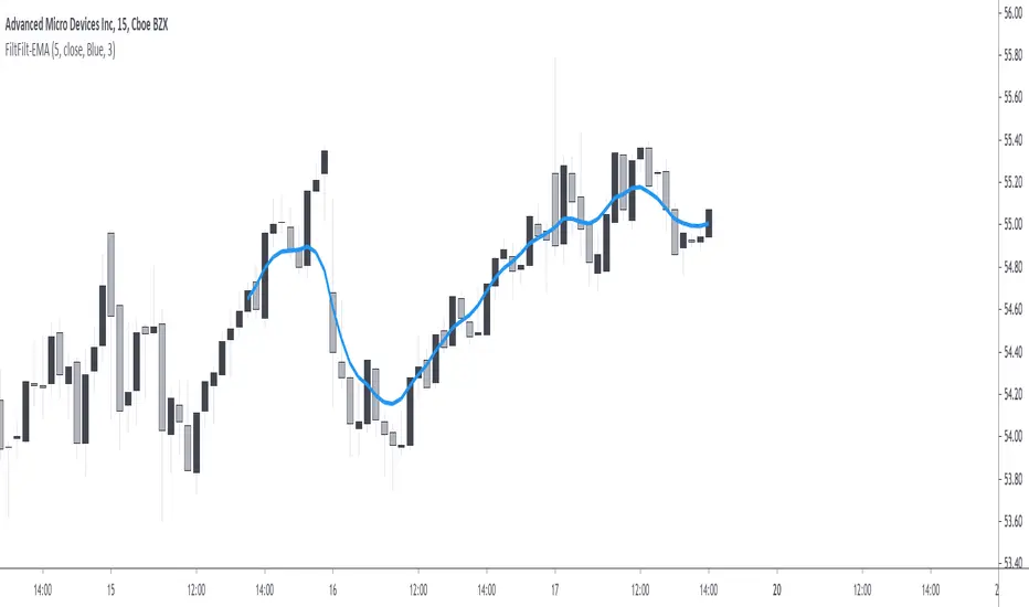 Perform forward-backward filtering using exponential averaging, thus providing a zero-phase exponential moving average. The output repaint and cannot be used as input for other indicators.