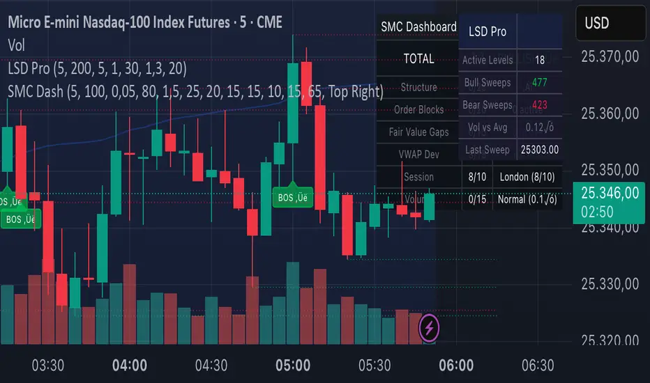 Detect liquidity sweeps and stop hunts in real-time. Identifies swing high/low clusters, detects price sweeps with wick rejection and volume confirmation. Features: Adaptive swing detection, liquidity zone clustering, sweep + reclaim confirmation, volume spikes, visual zones, alerts. Best on futures (MNQ, ES, NQ), crypto, forex 1m-15m. Part of the Hypefield Labs Smart Money Pro Bundle — get access at whop.com/hypefield-labs