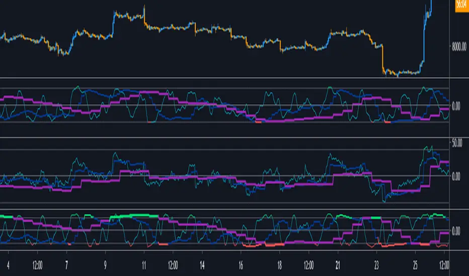 The oscillator has been centered, as opposed to the normal 0-100. There are overbought and oversold boundaries defaulted at 40 and -40, respectively. When any of the 3 main indicators cross one of these boundaries, either a green or red signal is displayed. This can be turned off in the options.