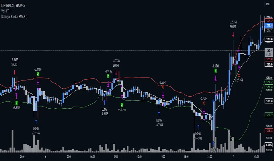 Uses Bollinger Bands (no basis line) and a 9 period EMA.