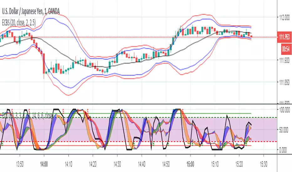 Fill in the Stochastic RSI's. Colors change between the K and D lines. When K is above D it's one color and when below it's another.
