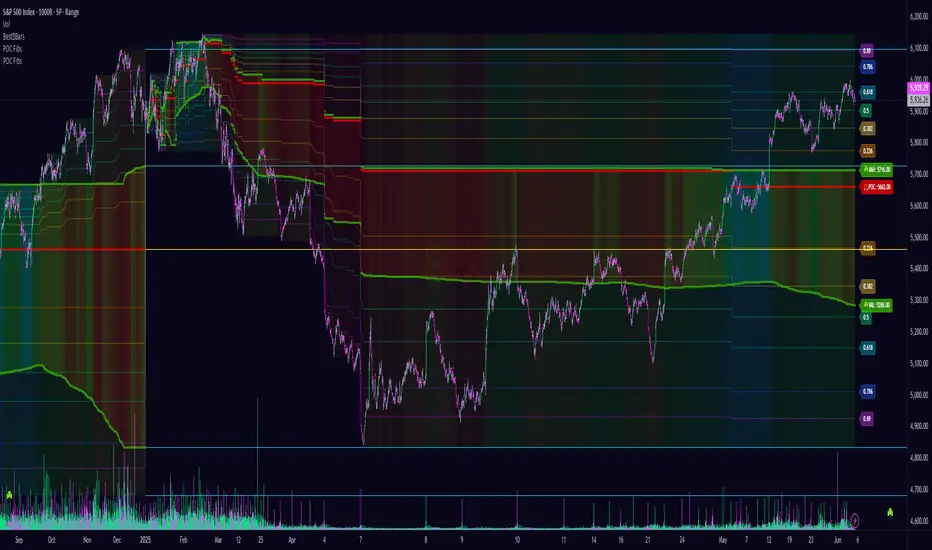Calculates and plots Fibonacci retracement/extension levels based dynamically on the range between the developing POC and the developing VAH/VAL.