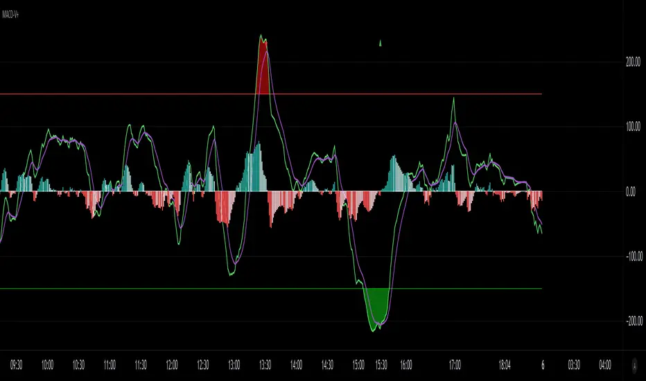MACD-V+ is an ATR-normalized MACD tool that focuses on true turning points inside Overbought/Oversold zones. It marks a signal only when the MACD’s slope changes direction and shows real progress back toward the zero line, with an optional dwell (depth & time) filter so you don’t get faked out by shallow pokes into a zone. Clean visuals, “first-in-zone” gating, and configurable labeling make it practical for discretionary and systematic traders alike.