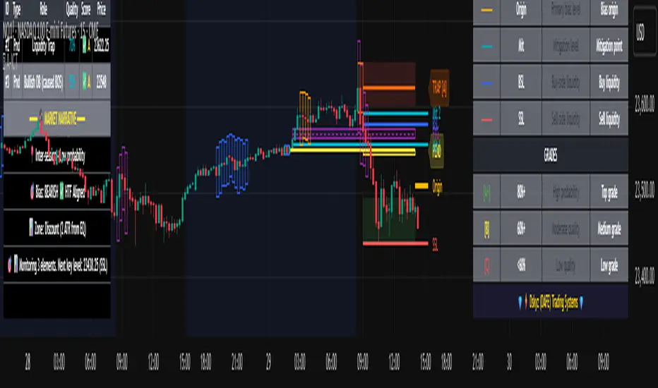ICT Metrics & Breakdown: This is your statistical overview. Total Elements shows how much structure the script is tracking. High Quality instantly tells you if there are any A/B grade setups nearby. Unmitigated vs. Mitigated shows the balance of fresh opportunities versus resolved price action. The breakdown by Order Blocks, Trap Zones, etc., gives you a quick read on the market's recent character.