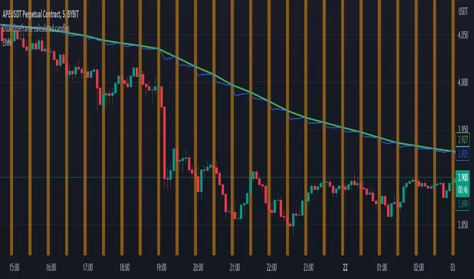 Chart update for clarity. Green line is the EMA function applied to the chart with its timeframe set to 30 mins. As you'll see it coincides with the values the script calculates every 6 bars, but between those times the calculated EMA differs as the close from each 5 min candle would change the most up to date HTF line as well.發行說明