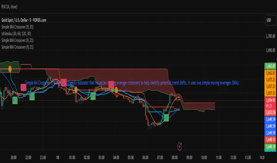 Simple MA Crossover is a beginner-friendly indicator that visualizes moving average crossovers to help identify potential trend shifts. It uses two simple moving averages (SMA):