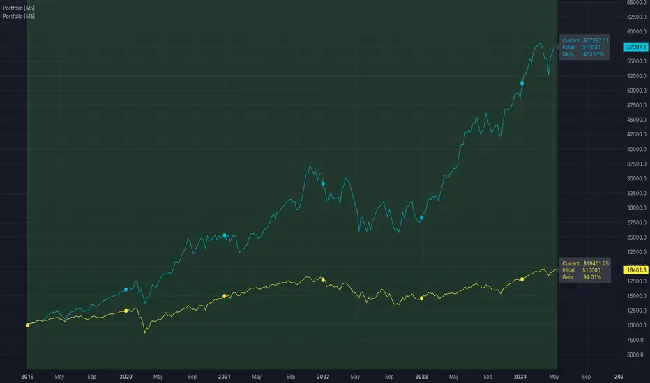 To compare two or more portfolios, add this indicator multiple times, click and drag one on top of the other (into the same pane), then pin both to the same scale.