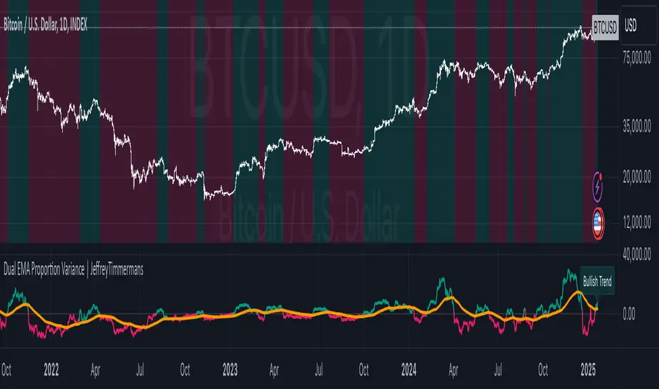 The "Dual EMA Proportion Variance" Indicator provides a robust way to analyze price trends, volatility, and momentum using dual EMA calculations combined with percentile-based thresholds. This approach enables traders to identify significant bullish and bearish trends while incorporating smoothing and tailoring options for better adaptability.