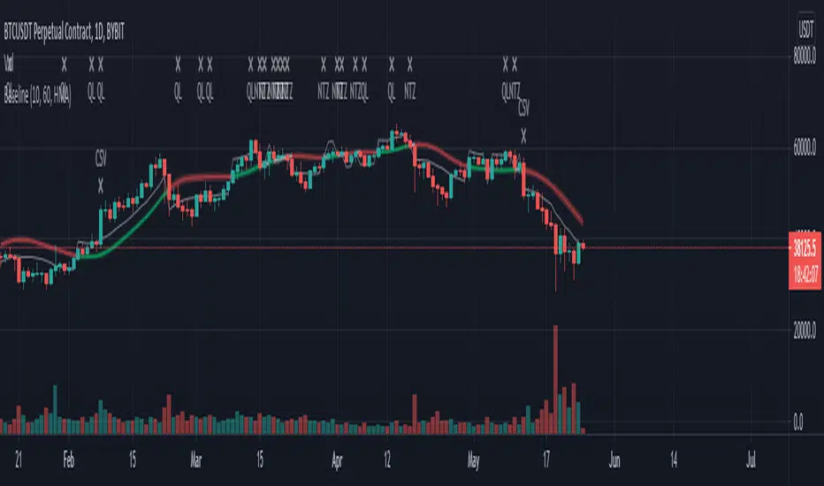 Moving average baseline comprised of [SMA, EMA, HMA] and an adjustable Keltner Channel band around the MA.